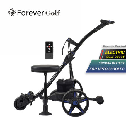 Lithium Battery Remote Control Electric Golf Trolley with a seat, Sand bucket holder, phone holder Golf Buggy-Black Frame+Blue Wheels