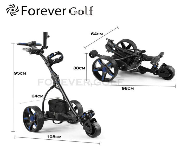 - Included electric golf trolley, Remote Control, Luxury Seat, 12V/36AH Lead Acid battery, Power Charger, an umbrella holder, a scorecard holder, a drinks holder, USB Port, Sand Bucket holder, Phone holder.