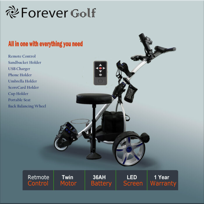 - Included electric golf trolley, Remote Control, Luxury Seat, 12V/36AH Lead Acid battery, Power Charger, an umbrella holder, a scorecard holder, a drinks holder, USB Port, Sand Bucket holder, Phone holder.