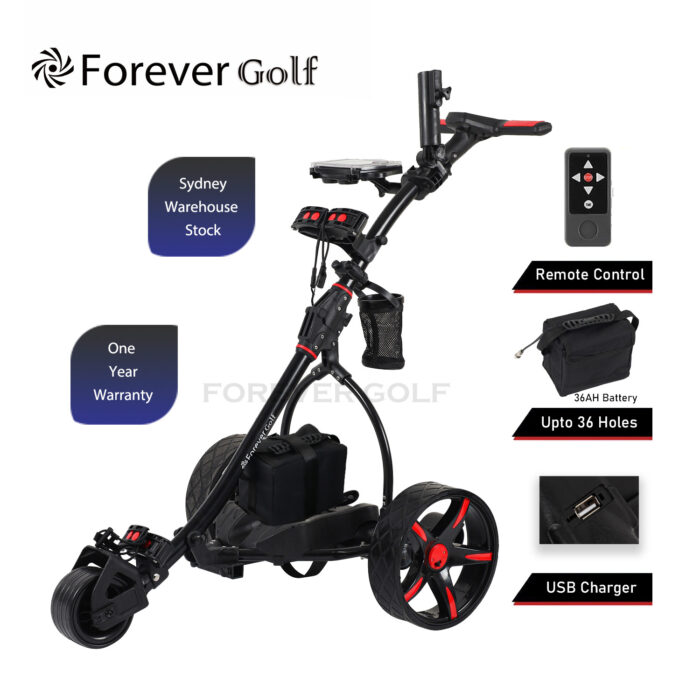 - Included electric golf trolley, Remote Control, 12V/36AH Lead Acid battery, Power Charger, an umbrella holder, a scorecard holder, a drinks holder and USB Port