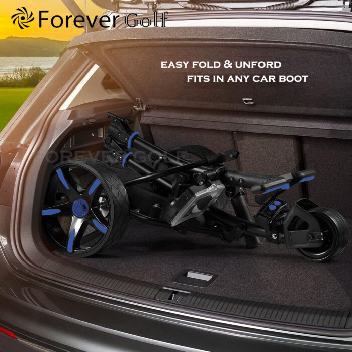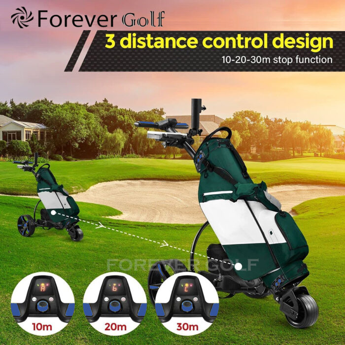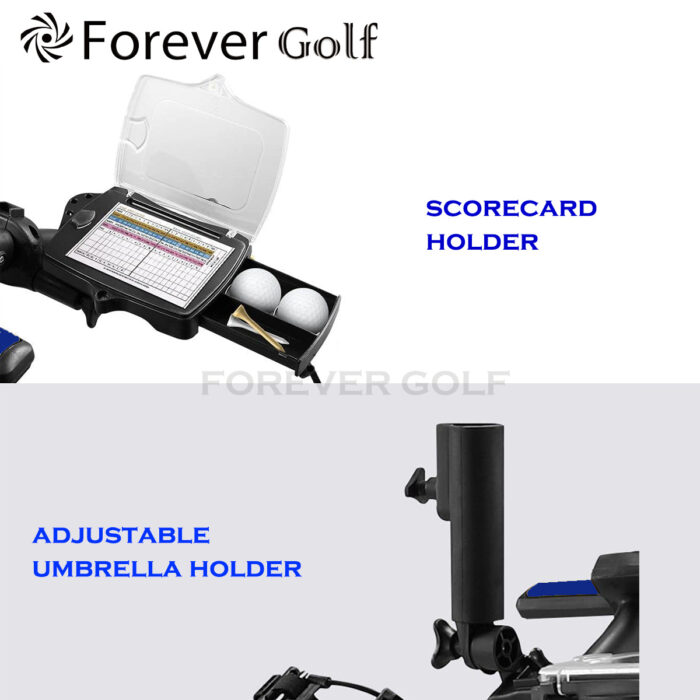 - Included electric golf trolley, Remote Control, Luxury Seat, 12V/36AH Lead Acid battery, Power Charger, an umbrella holder, a scorecard holder, a drinks holder and USB Port