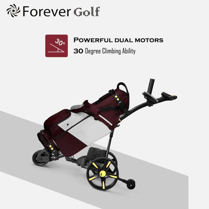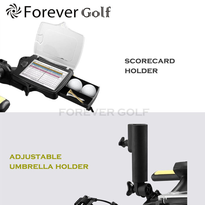 - Included electric golf trolley, Remote Control, Luxury Seat, 12V/36AH Lead Acid battery, Power Charger, an umbrella holder, a scorecard holder, a drinks holder and USB Port